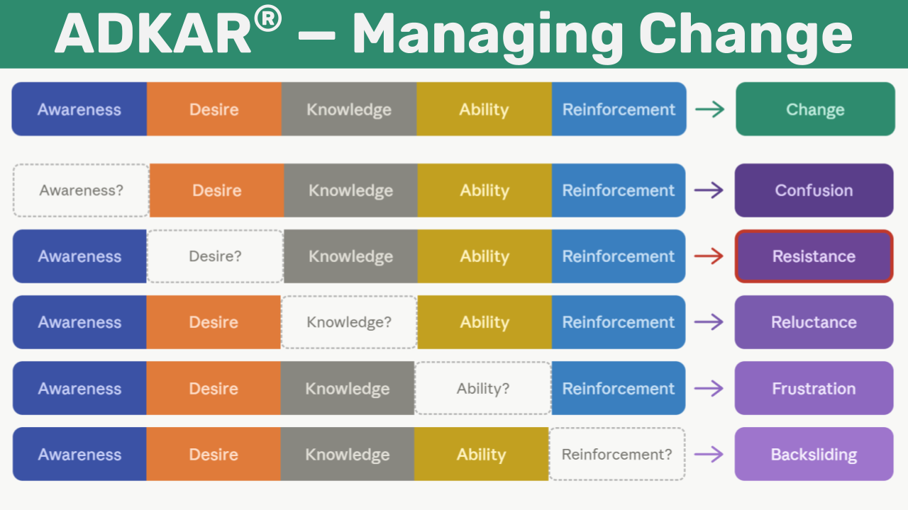 This is precisely where ADKAR® becomes not just a planning tool but a diagnostic one. Each of those five failure modes maps directly to a missing element: