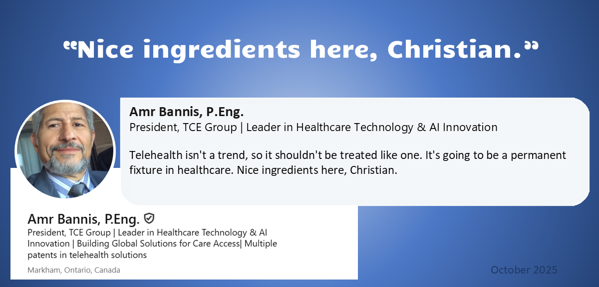 Christian has the skill set, the capabilities and abilities to successfully work in any healthcare organization to develop a telemedicine program. If an organization is looking at establishing a telemedicine program, it would be well worth their time to have a conversation with Christian about their project and about the results that they are hoping for.